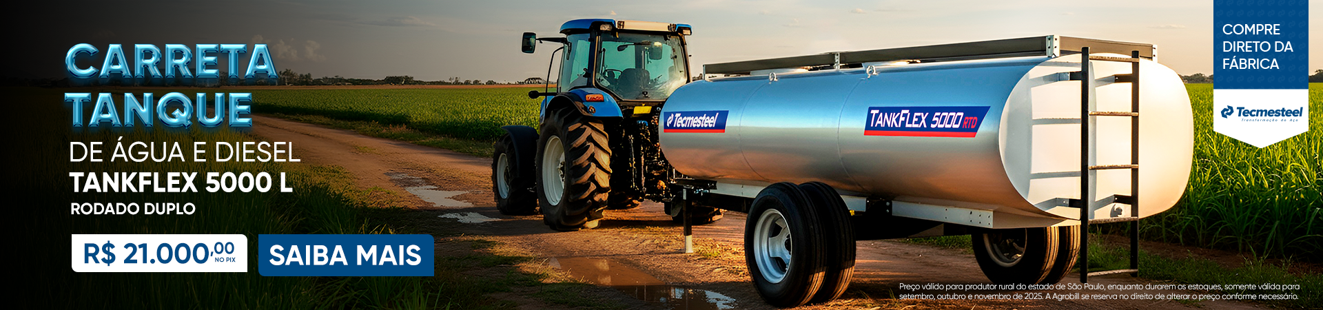Outra carreta que você encontra na Agrobill é a ABAPU da Mepel, que serve para transporte de água para abastecer pulverizadores e lavagem de máquinas e galpões. Com capacidade de até 12.500 litros, essa carreta possui registro regulador de pressão e vazão, levante mecânico ajustável para facilitar o acoplamento no trator, além de acessórios como mangueira de carga e esguicho, bico leque aspersor e eixo cardan com proteção.